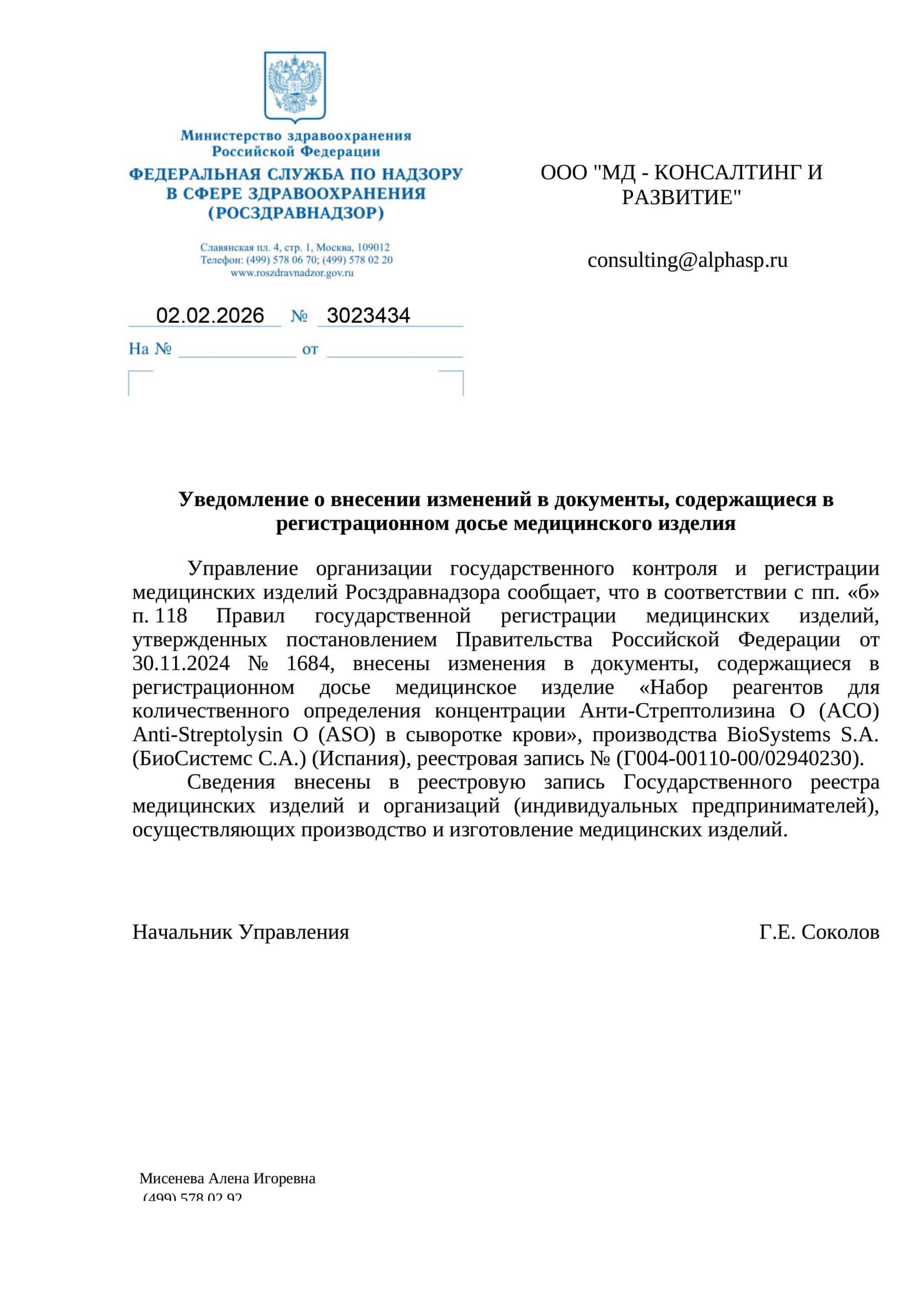 Уважаемые клиенты! Вышло обновление регистрационных удостоверений на набор реагентов для количественного определения концентрации Анти-Стрептолизина О (ACO) Anti-Streptolysin O (ASO) в сыворотке крови в вариантах исполнения (РЗН 2022/16441)